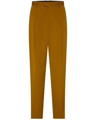Bottega Veneta's Powder-grain wool pants showcase a refined straight cut with pleats on the front, embodying sophistication. The low-waisted fit features belt loops and a buttoned zipper closure, complemented by a hook and loop tab closure. Ankle length with side and welt pockets, these formal pants elevate any wardrobe with visible stitching and a back pocket.