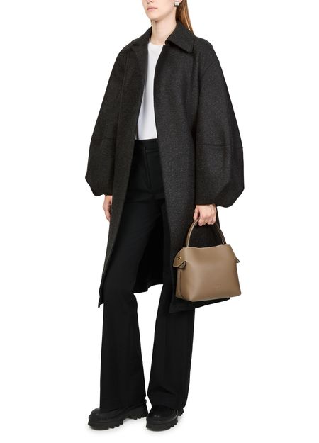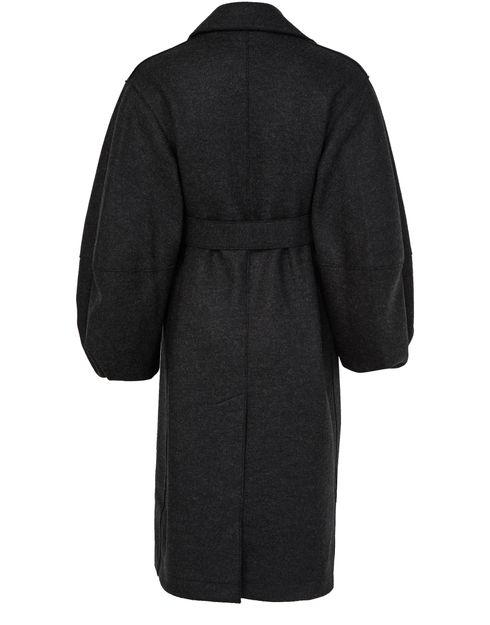 Introducing Harris Wharf London's puff-sleeved coat in pressed wool, a sophisticated knee-length design featuring a classic collar, long sleeves, and convenient side pockets.