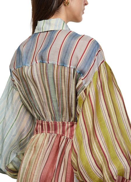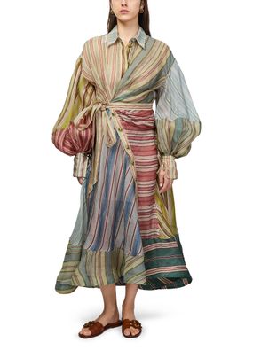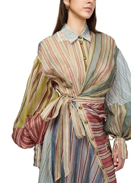 Reveal Zimmermann's Rebellion striped midi dress, a statement piece defined by its multicolor striped print and asymmetric cut. The buttoned-down collar and long, cuffed sleeves add refined structure, while the wrap silhouette and button fastening ensure a flattering fit for any occasion.