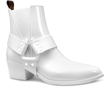 The Rhapsody ankle boot, originally created by Nicolas Ghesquière for the Fall-Winter 2019 fashion show, is reinterpreted in glossy waterproof rubber for a stylish look even on rainy days. Key details of this biker-inspired design are its pointed toe and sturdy heel, while its distinctive harness is embellished with Louis Vuitton-engraved studs.