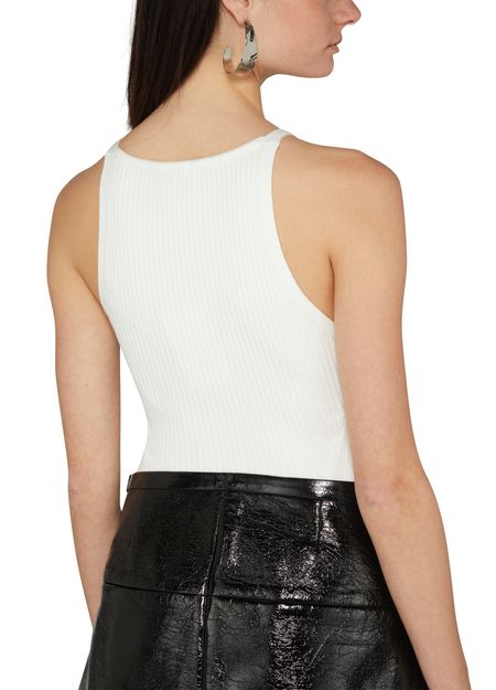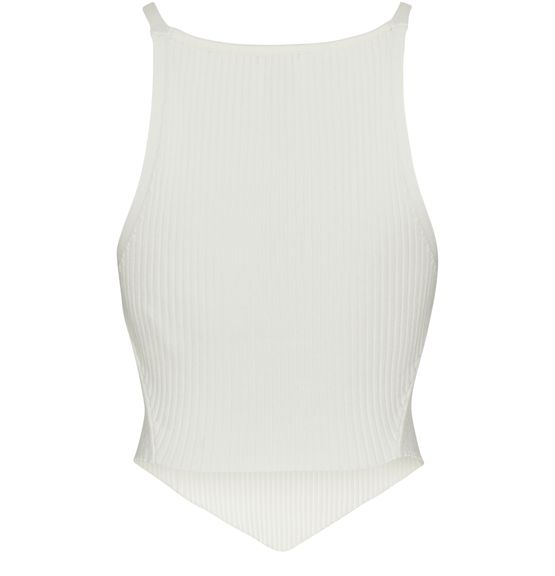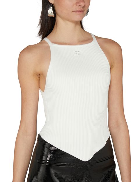The Rib Knit Pointy Tank Top is a stylish triangle top with a square neck and thin shoulder straps. It features a front logo detail and is designed to be slim fitting for a flattering silhouette. This versatile piece can be dressed up or down for a variety of looks.