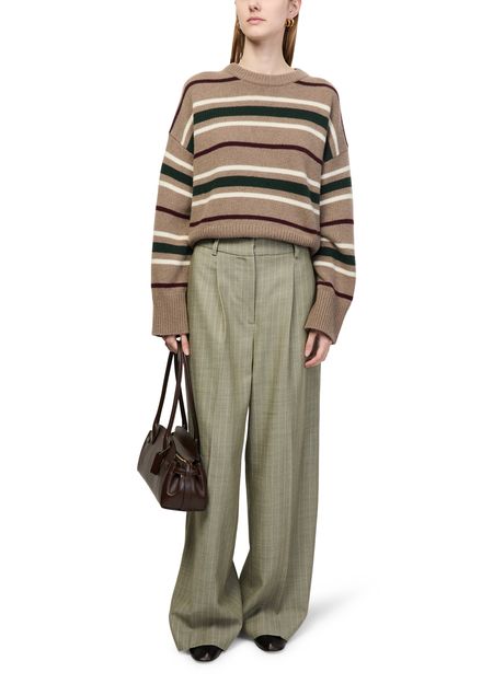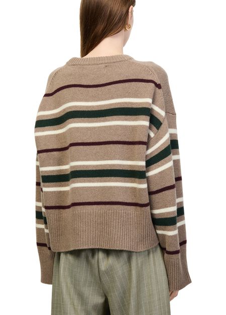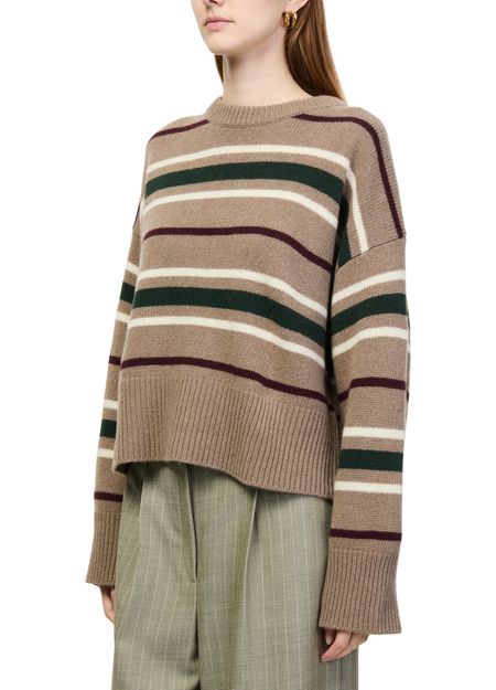 Reveal Skall Studio's crop round neck sweater, crafted in ribbed fabric with a striped print. The dropped sleeves and long-sleeved silhouette offer a relaxed yet refined look, making it a versatile choice for layering or pairing with high-waisted pieces for a modern statement.