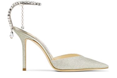 Jimmy Choo's Saeda 100 pumps feature a chic pointed toe and elegant stiletto heel that exude sophistication. The very thin sole adds a delicate touch to the design, while the crystal-embellished strap and hook fastening accentuate the glamorous look. With a logo-printed insole and contrasting details, these pumps are a stylish statement piece.