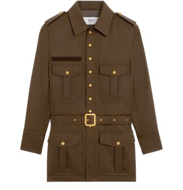 • Description : classic fit, shirt collar, 2 flap patch pockets on the chest, 2 flap patch pockets, fabric belt with metallic buckle, 2 shoulder tabs, 8 Triomphe buttons, 5 Triomphe buttons on the cuffs, triomphe buttons on the pockets and shoulder tabs, made in italy.