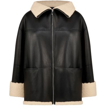 Shearling jacket is a sophisticated outerwear piece crafted from smooth leather. With a straight, wide cut and a lined interior, it offers both style and warmth. It features a lapel collar, long sleeves, and a zipper closure for a sleek look. The fur detail adds a luxurious touch to this timeless wardrobe staple.