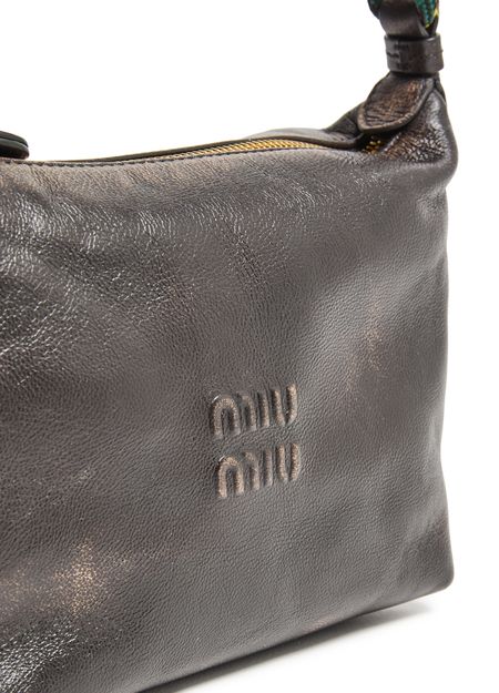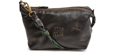 Reveal Miu Miu's shoulder bag with small round strap, crafted from distressed leather and adorned with metallic Miu Miu lettering. The embroidered strap and signature bi-color cord detail add a modern twist, while the gold finish and zipper closure ensure both style and security.