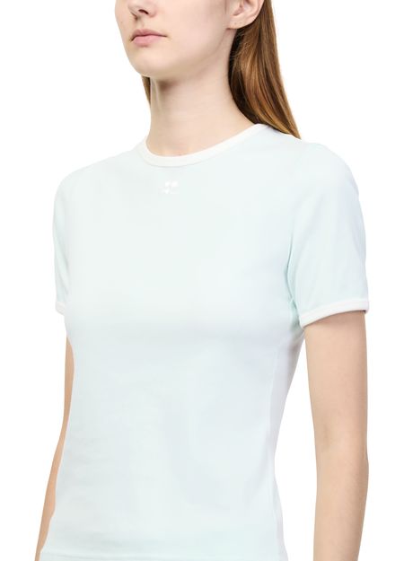 Reveal Courreges's Signature Contrast t-shirt, featuring a crew neck and short sleeves for a refined silhouette. The smooth fabric and bold contrast details make this top a standout piece, perfect for pairing with tailored pants or relaxed denim for a modern, versatile look.