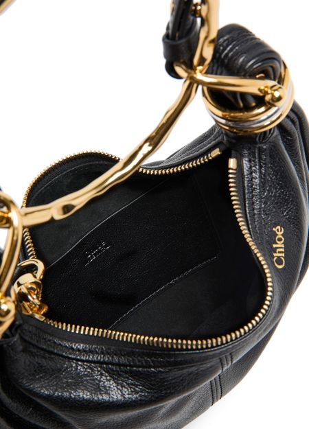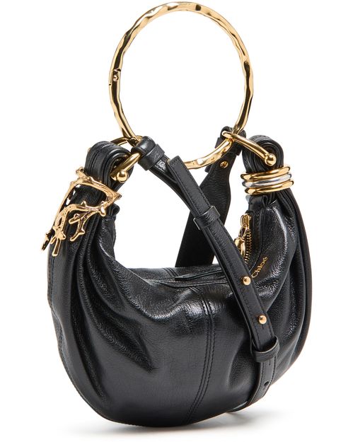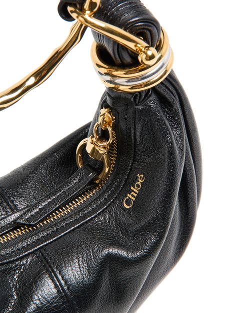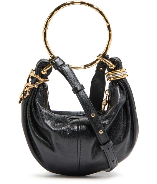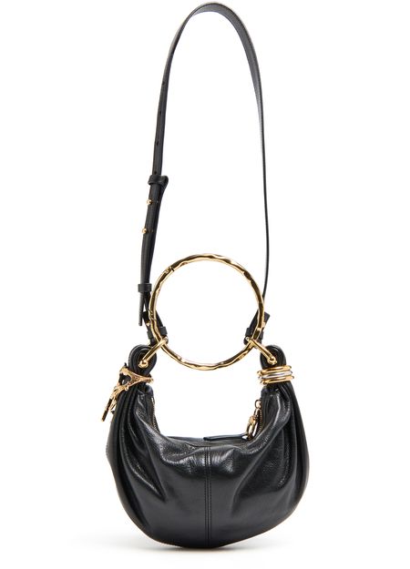 Chloé's Small Bracelet bag is a chic baguette bag that exudes elegance. With a zipper closure and visible topstitching, it showcases an engraved logo on the front. This stylish piece features a single compartment, hand carried or worn on the shoulder, with an adjustable thin strap and double handles, adorned in a gold finish.