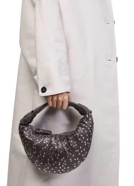Inspired by the emblematic Croissant line, the Fortune Croissant bag introduces a new silhouette worn by hand or on the shoulder. Its folded half-moon shape is achieved through an assembly of topstitched panels, enriched with knotted details. This mini version is crafted in nappa leather with studs, a soft and supple material with a smooth, textured hand from a certified tannery.