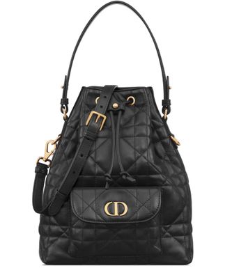 Discover Dior's Small Dior Caro Bucket Bag, a statement piece featuring a CD signature on the front. With a drawstring closure, front slip pocket with magnetic flap, interior slip pocket, and both removable top handle and adjustable shoulder strap, it combines elegance with functionality.