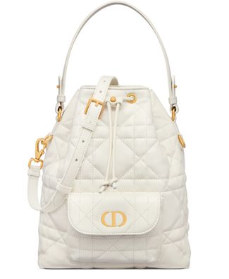 Discover Dior's Small Dior Caro Bucket Bag, a statement piece featuring a CD signature on the front. With a drawstring closure, front slip pocket with magnetic flap, interior slip pocket, and both removable top handle and adjustable shoulder strap, it combines elegance with functionality.