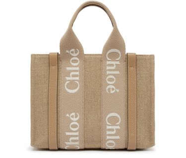 The Small Woody tote bag from Chloé features a detachable wide strap with gold finish details, offering versatile styling options. It can be hand-carried or worn on the shoulder, making it suitable for any occasion. The interior patch pockets provide convenient organization for everyday essentials.