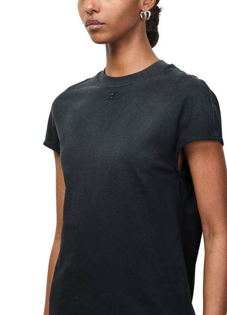 Reveal Courreges's solarized oversized t-shirt, a modern top featuring a crew neck and cap sleeves for a relaxed silhouette. The faded effect adds a contemporary twist, making it perfect for pairing with jeans or tailored pants for a versatile, standout look.