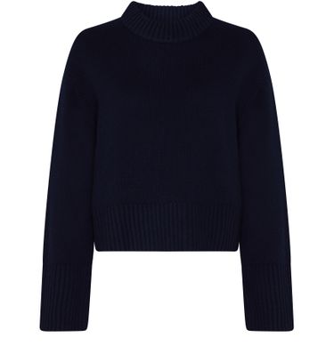 Reveal Lisa Yang's cashmere round-neck sweater, a cropped knitwear piece with a ribbed texture and dropped long sleeves. The round neckline and relaxed fit offer effortless sophistication, making it a versatile choice for layering or standalone styling across seasons.