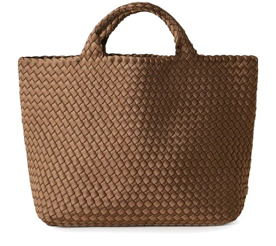 Reveal Naghedi's St Barths medium tote, crafted in open weave for a contemporary edge. Double handles and visible stitching add refined structure, while the embossed logo delivers a signature touch. This tote blends modern design with everyday versatility, making it a standout accessory for any occasion.