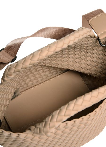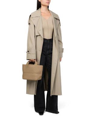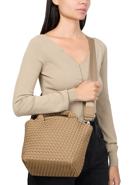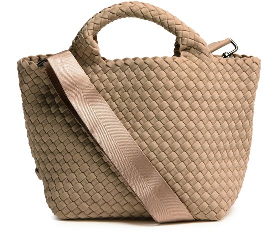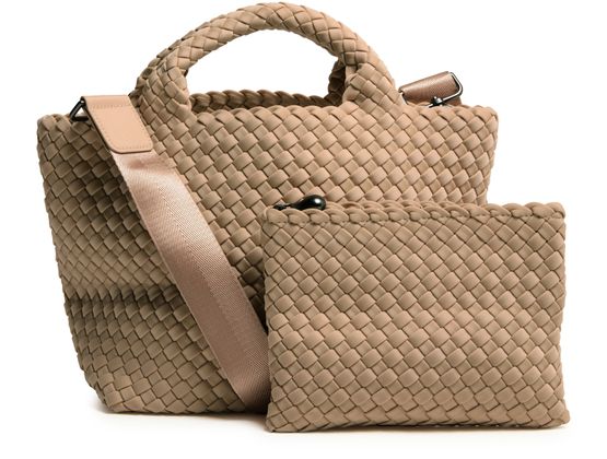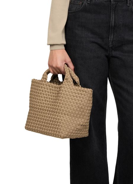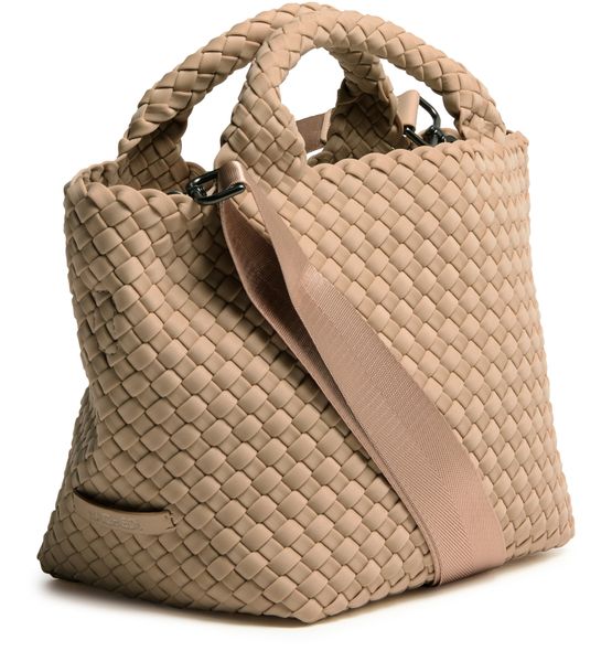 Reveal Naghedi's St Barths small tote, crafted in open weave for a modern, textured look. Double handles and a wide, adjustable, detachable strap offer versatile carrying options, while visible stitching adds a refined touch. This tote blends functional design with contemporary style for everyday sophistication.