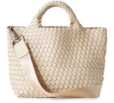 Reveal Naghedi's St Barths small tote bag, a masterpiece of modern design. Crafted with an open weave and featuring double handles, this tote offers both style and functionality. The adjustable, detachable strap and detachable interior purse add versatility, making it a perfect companion for any occasion.