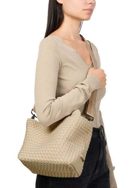 • Description : Shopper / tote bag, shoulder bag, crossbody bag, double handles, carry handle, wide strap, adjustable, detachable strap, open weave, fabric, visible topstitching.