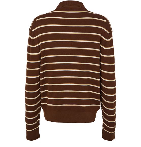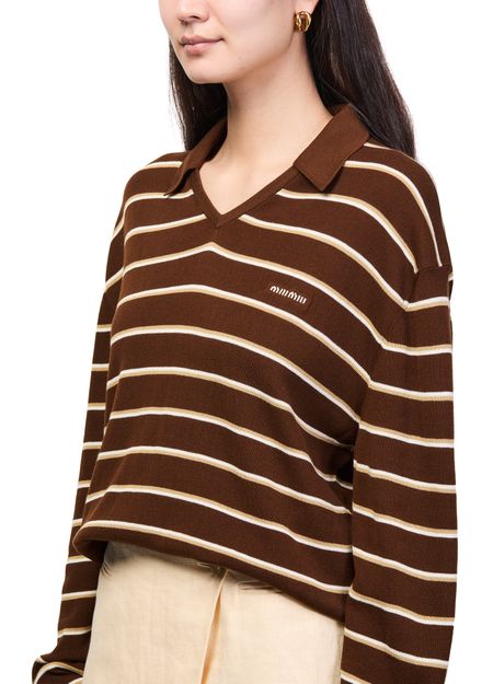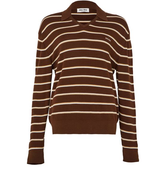 Reveal Miu Miu's striped polo shirt, featuring a refined V-neck and long sleeves for a sleek silhouette. The signature embroidered "Miu Miu" logo adds a distinctive touch, while the striped print brings a modern edge—perfect for elevating both casual and polished looks.