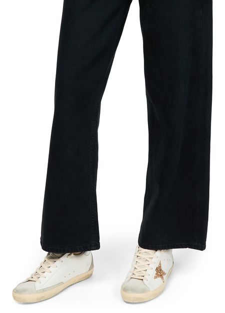 Introducing Golden Goose's Super-Star with gold glitter star and suede inserts. These sneakers feature a closed round toe and a flat heel, crafted from smooth leather and suede. The contrasting sole and visible stitching add a modern touch, while the logo on the tongue and back ensures brand recognition.
