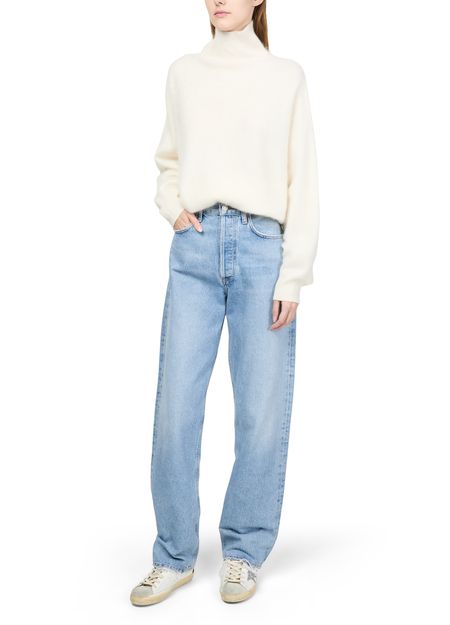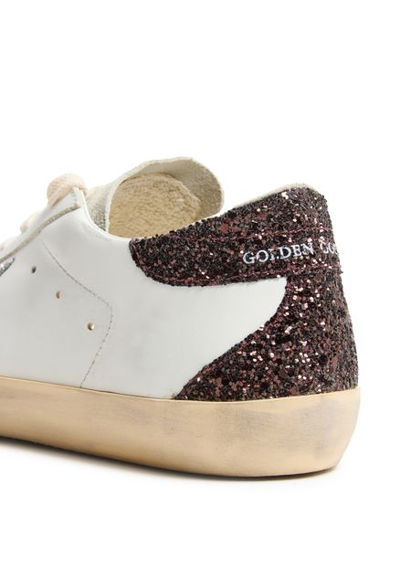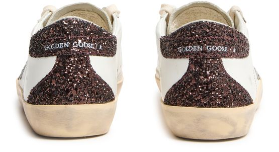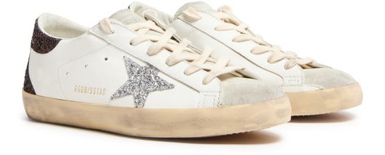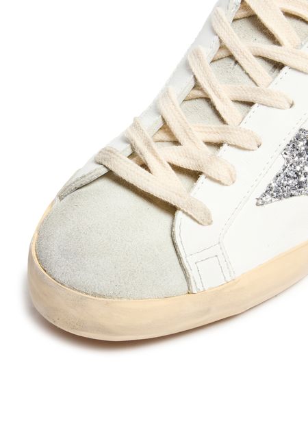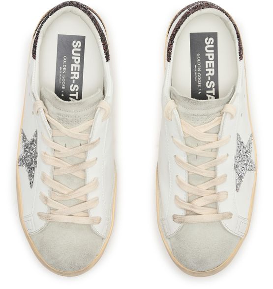 Introducing Golden Goose's Super-Star with silver star and glitter heel tab. These sneakers feature a smooth leather and suede construction, complemented by a closed round toe and flat heel. The contrasting sole and visible stitching add a modern touch, while the logo-printed insole and logo at the back ensure brand recognition.