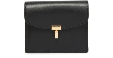 Toteme's T-Lock leather card holder showcases a sleek design with a twist lock closure and a practical flap closure. Adorned with a printed logo in gold letters, it exudes elegance. The visible topstitching adds a refined touch, making it a perfect accessory for those who appreciate understated luxury.