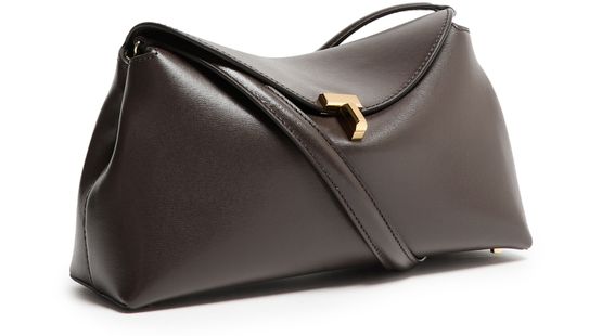 Reveal Toteme's T-Lock leather clutch bag, crafted from smooth leather with a refined gold finish. The adjustable thin strap and flap closure with logo clasp offer both versatility and sophistication. Visible stitching and a single interior pocket complete this modern, functional accessory.