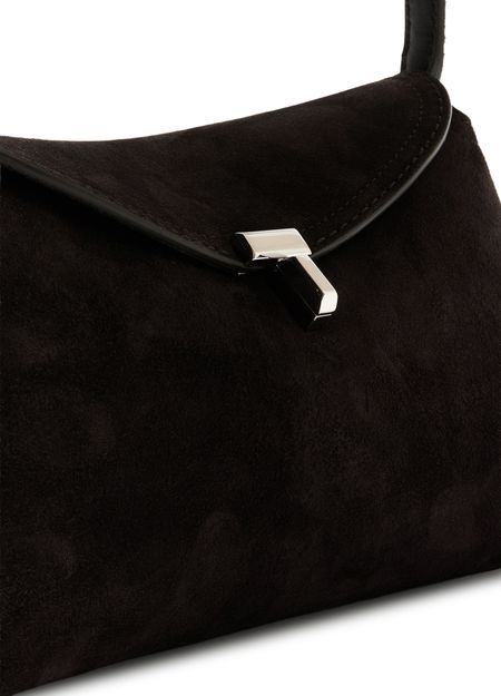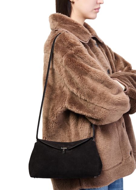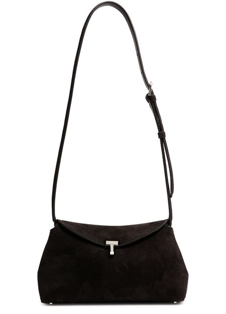 Reveal Toteme's T-Lock suede clutch bag, crafted from velvety suede with a refined silver finish. The adjustable thin strap and flap closure with logo clasp offer both style and practicality, while the interior pocket and single compartment ensure effortless organization for your essentials.