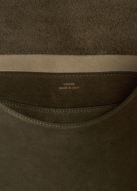 Reveal Toteme's T-Lock suede satchel, crafted from supple suede with a single handle for effortless sophistication. The gold-finish logo clasp and metallic logo on the front add a refined touch, while the interior pocket and visible topstitching showcase functional elegance and meticulous attention to detail.