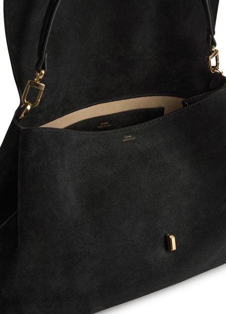 Reveal Toteme's T-Lock suede satchel, crafted from supple suede with a single handle for effortless carrying. The gold-finish logo clasp and metallic logo on the front add a refined touch, while the spacious interior compartment and interior pocket ensure both style and practicality.