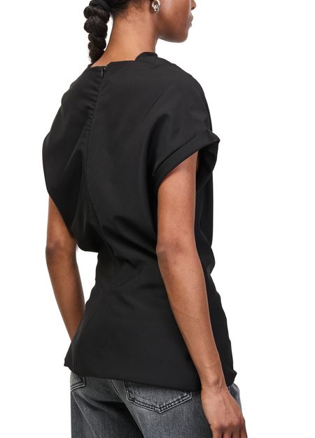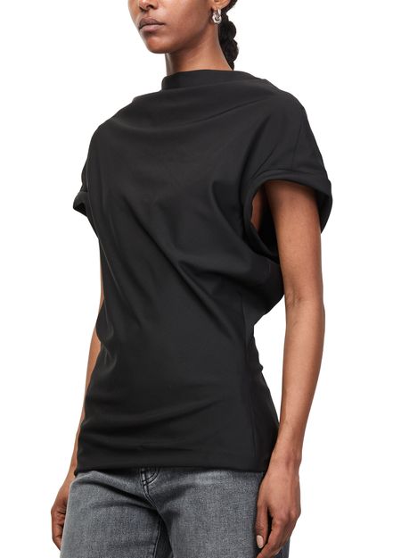 Reveal Khaite's Tandie short-sleeved top, defined by its elegant mockneck and refined cap sleeves. The sleek silhouette and subtle structure make it a versatile piece, perfect for layering or wearing solo. Pair this modern top with tailored trousers or denim for a polished, contemporary look.