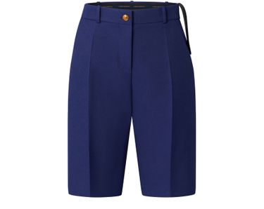 A contemporary Louis Vuitton tailoring essential: These Bermuda shorts are crafted from crisp technical gabardine for a smart, structured look, accentuated with topstitched front seams. Finished with a chic brass button and a refined back pocket. An oversized leather Monogram belt loop adds an iconic signature to the waistband.