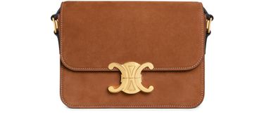 Reveal Celine's Triomphe Teen bag in nubuck calfskin, featuring a chic gold finish. Designed for crossbody and shoulder carry, it boasts a Triomphe metal clasp, three interior compartments, a zipped pocket, and a flat pocket. The adjustable shoulder strap ensures a perfect fit for modern elegance.