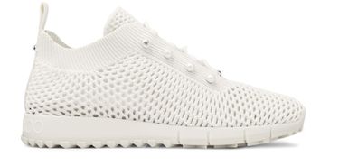 Jimmy Choo's Veles crochet sneakers showcase a stylish design with a rounded toe and a secure fermée fit. Adorned with a silver logo at the front and engraved details at the back, these sneakers feature silver finishes and pearl accents, offering a touch of elegance on the side for any occasion.