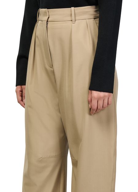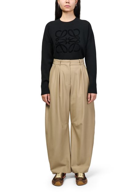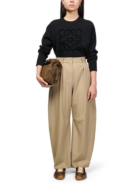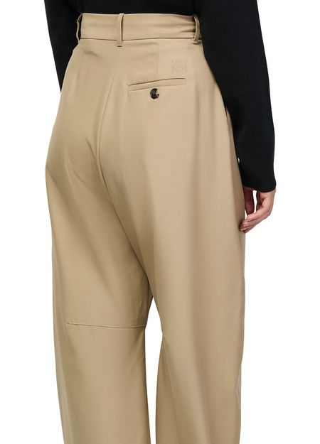 Reveal Loewe's wool barrel-leg trousers, crafted in an ankle-length silhouette with refined front pleats and visible stitching. The buttoned zipper closure and belt loops add functional elegance, making these formal pants a versatile choice for both professional and elevated everyday looks.