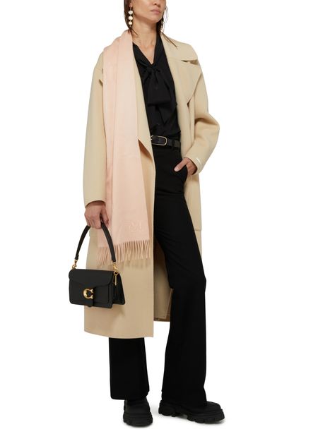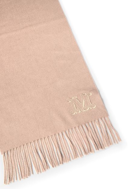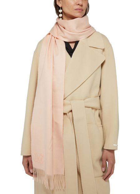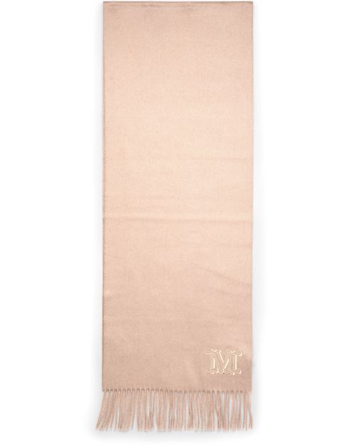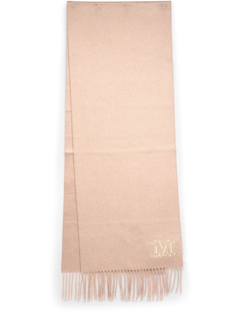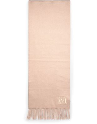 Max Mara's Wsdalia logo scarf features a front logo design with an embroidered logo for a touch of luxury. The scarf is adorned with fringe details along the edges, adding a stylish and sophisticated touch to any outfit. The fringed edges give the scarf a classic and elegant look.