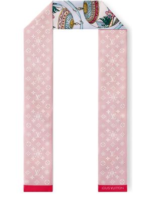 The Xmas Vivienne bandeau is a celebration of the holiday spirit in sumptuous, colorful silk. Against a backdrop of Christmas decorations adorned with Monogram motifs, the House’s adventure-loving mascot Vivienne is depicted enjoying three sports: sailing, ice skating and tennis, complete with an LV signature racket. A fun and festive accessory for the year-end season.