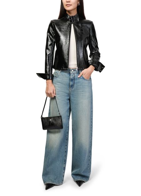 Reveal Courreges's zipped naplack pouch, a sleek shoulder bag featuring a single handle and padded texture. The metallic logo on the front and silver finish add a refined touch, while the zipper closure and single compartment ensure both style and practicality for modern essentials.