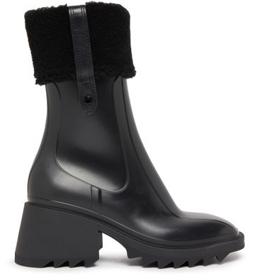 The Chloé Betty boots feature a rounded square toe and notched sole, with a square heel for added stability. The turn-up hem and fur detail add a touch of luxury, while contrast details provide visual interest. The logo on the side and pull-on design make these boots both stylish and practical.