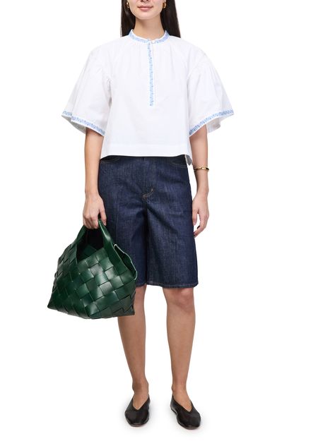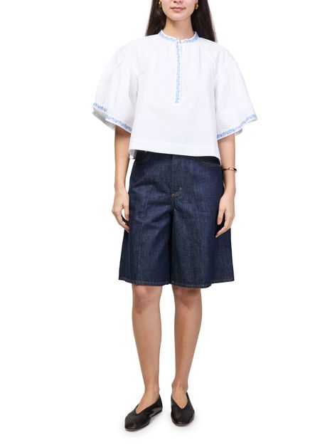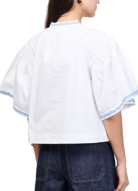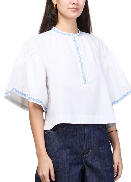 Reveal Skall Studio's Bonne blouse, featuring a refined high-neck and flared short sleeves for a contemporary silhouette. The soft drape and subtle structure make this top effortlessly versatile, pairing seamlessly with tailored trousers or relaxed denim for a polished, modern look.