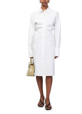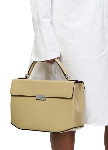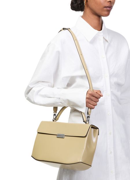 Reveal Toteme's clip box-style top handle bag, crafted from glossed leather with a single handle and flap closure. The visible stitching and silver finish add a refined touch, while the structured silhouette ensures a modern, polished look for any occasion.