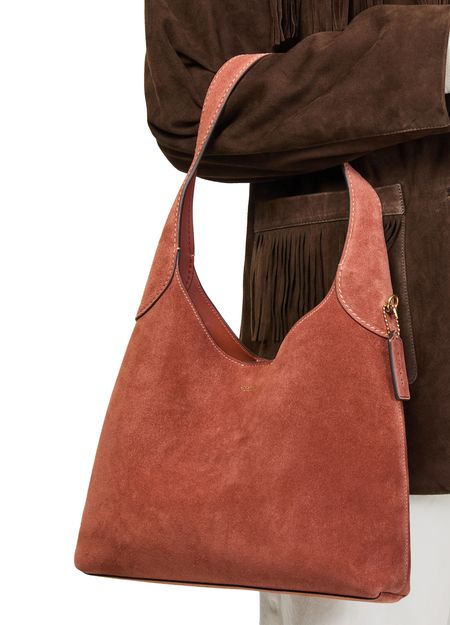 Reveal Coach's Brooklyn 28 hobo, where a decorative label with an embossed Coach logo and gold-finish hardware set a refined tone. The wide strap and single handle offer versatile carrying, while visible topstitching and a spacious interior compartment blend modern design with everyday practicality.