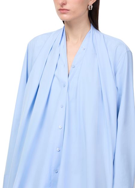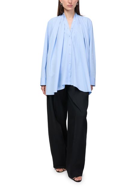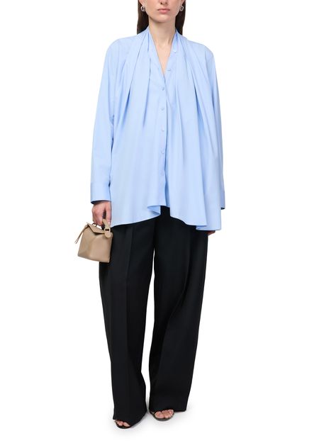 Reveal Loewe's long-sleeved cotton shirt, featuring a striking V-neck and a hand-crafted asymmetric drape with delicate gathers. The front buttoned closure adds a refined touch, making this top a versatile choice for both sophisticated and relaxed ensembles.