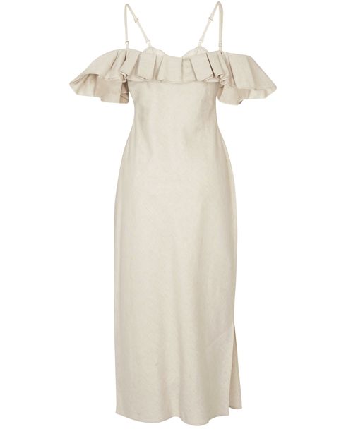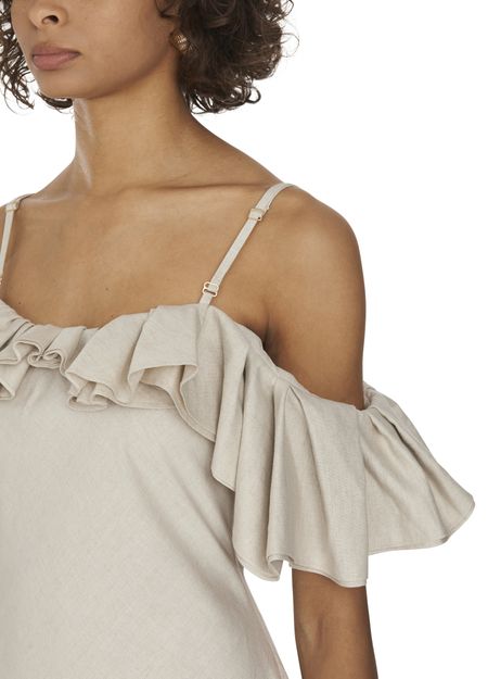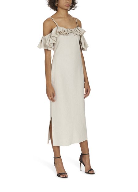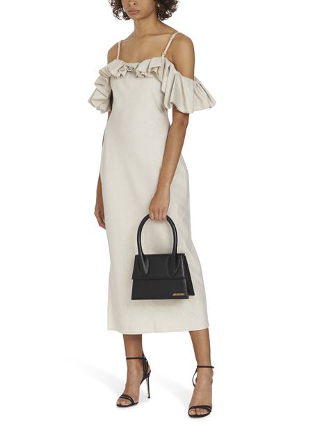 Jacquemus presents the Pampelonne dress with light, sophisticated details. This creation features an elegant bustier effect with a very glamorous ruffled effect. A piece that fits naturally at the waist to enhance the look.