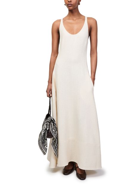 Reveal Toteme's sculpted cotton dress, a sleeveless maxi silhouette with a round neck and flared shape. Crafted from soft cotton, it features elegant shoulder straps and practical side pockets, blending comfort and sophistication for versatile day-to-evening wear.