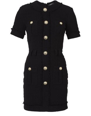 This short black tweed dress is designed by Balmain. Decorated with large gold buttons, wear with a pair of white patent ankle boots for a confidently preppy look.