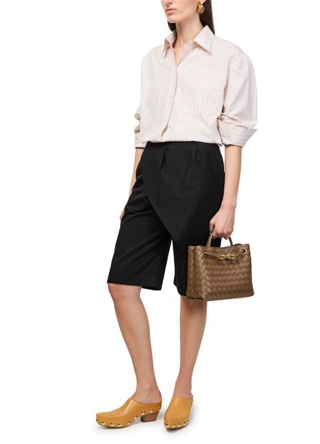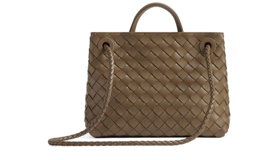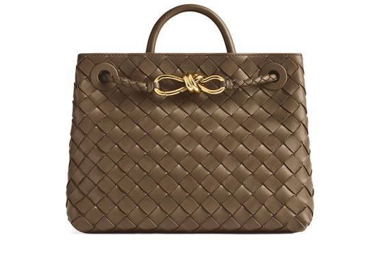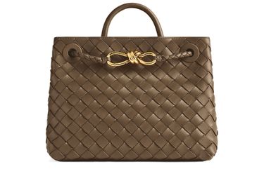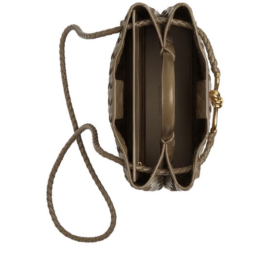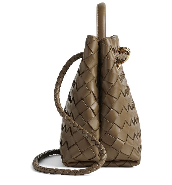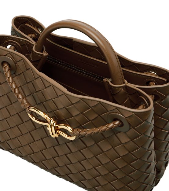 Reveal Bottega Veneta's Small Andiamo bag, showcasing the iconic Intrecciato weaving technique. Double handles and a thin strap offer versatile carrying options, while the gold finish and visible stitching add refined detail. A spacious interior with zippered pocket ensures both elegance and practicality for everyday essentials.