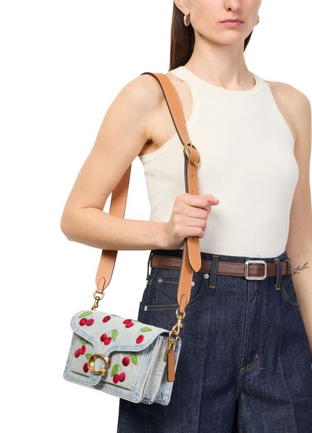 Reveal Coach's Tabby 26 shoulder bag, crafted in faded denim with a wide, adjustable strap for versatile styling. Embroidered details and a magnetic 'C' buckle add a refined touch, while the gold-finish hardware and embossed logo highlight Coach’s signature craftsmanship and modern appeal.