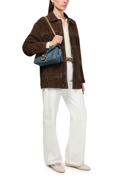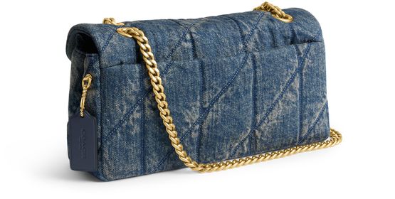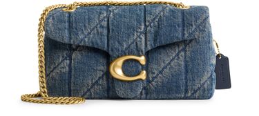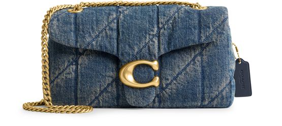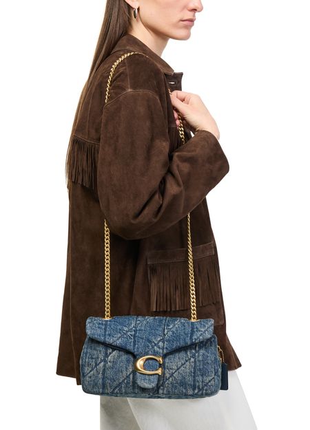 Reveal Coach's Tabby 26 shoulder bag, crafted in faded denim with a striking gold finish. The magnetic "C" buckle and decorative label with embossed logo add signature flair, while the chain strap and zippered interior pocket offer both style and practicality for modern versatility.