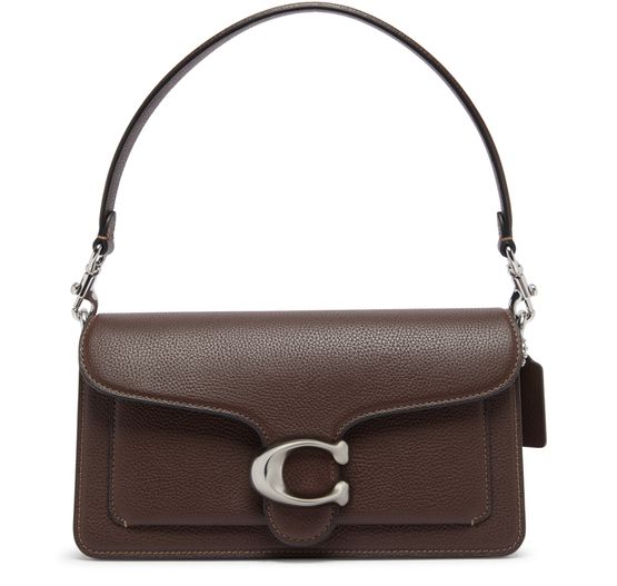 Reveal Coach's Tabby shoulder bag 26, a striking symbol of modernity. Its magnetic flap closure complements the silver-finish accents and metallic logo. The bag's versatility shines with a detachable strap, making it perfect for hand or shoulder carry. Inside, find an organized space with a zippered pocket.